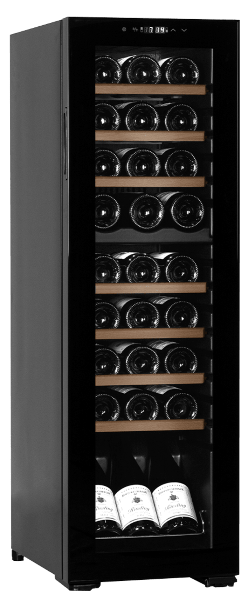 This wine fridge has the capacity, fully shelf mounted, to hold 27 Bordeaux style bottles. Larger, wide base bottles, like some Champagnes would require partial shelf removal whilst Burgundy and Alsatian bottles will fit upon the shelves.