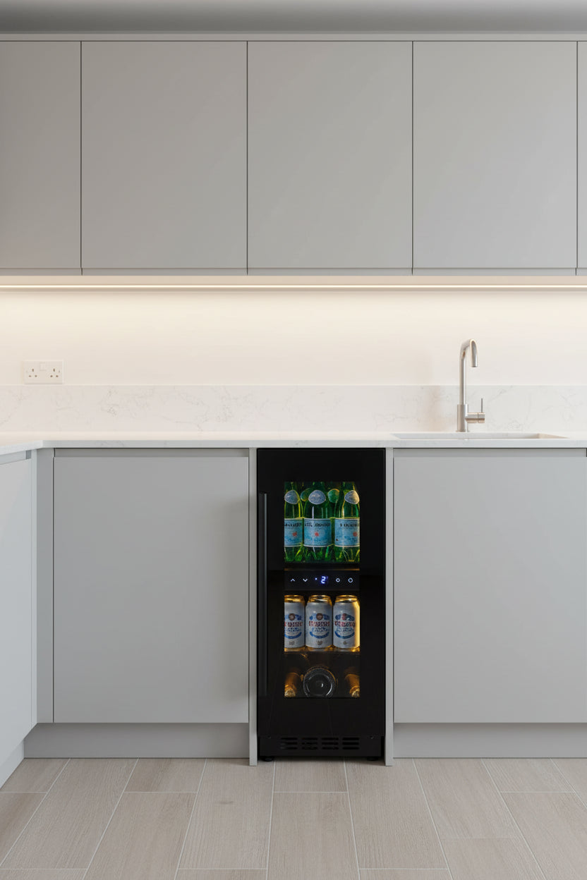 The CELLA BV18-BH beer fridge is a superb addition to any modern kitchen, offering both style and functionality. Its adjustable feet, undercounter bracket, and zero-clearance hinges make installation effortless, the UV protected door with black handle and compact design blend seamlessly into contemporary interiors. A single temperature zones (2–12°C), built-in alarms, glass shelves and dimmable LED lighting further enhance usability and presentation.