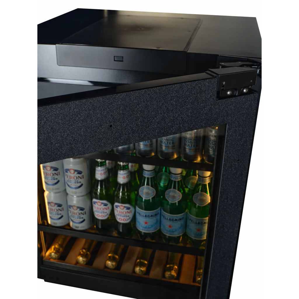 The BV34-PANEL-TO offers a capacity of 118 litres, accommodating up to 119 cans of 330ml each. It includes glass shelving and Hettich zero clearance hinges, ensuring the door opens without contacting nearby panels - an essential feature for seamless flush installation often neglected by other brands.