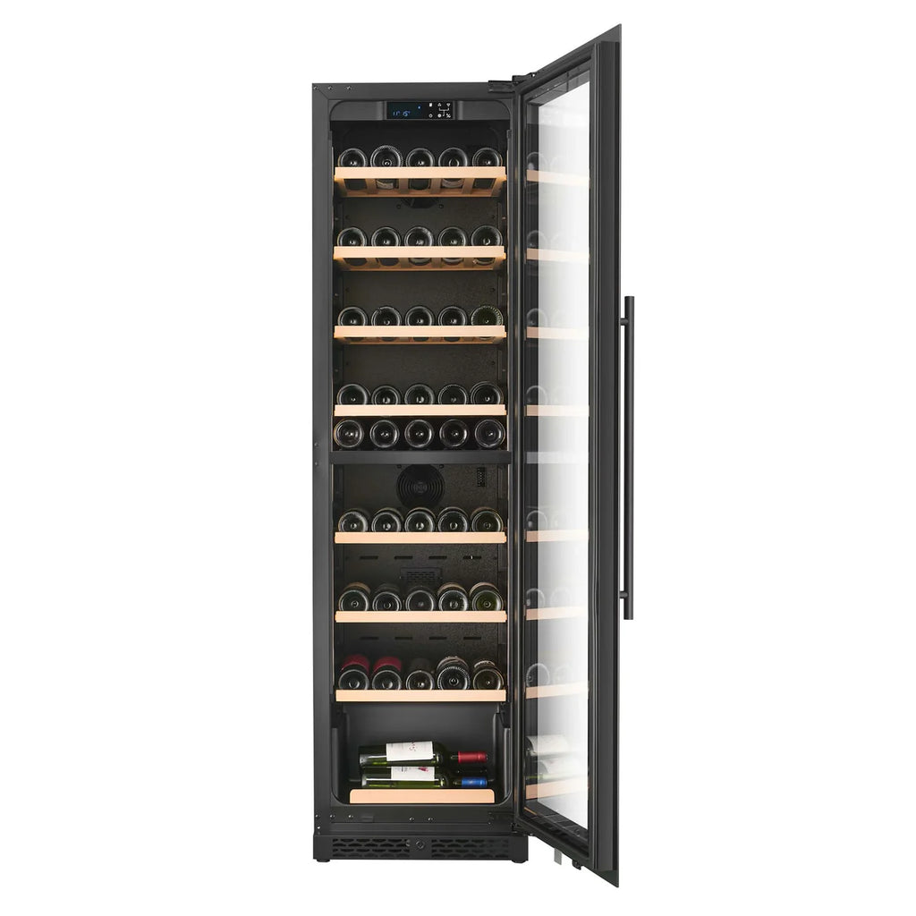 The CELLA W75D-BLACK wine fridge is a tall, shallow-depth (48cm) wine fridge designed to sit flush with kitchen units while offering the flexibility of freestanding or built-in installation. With front ventilation, zero-clearance soft-close hinges, and a standard 500mm cabinet fit, it integrates seamlessly into modern kitchens. The fridge holds 74 bottles, with shelves engineered to accommodate real-world bottle sizes, including Burgundy and Rhône bottles as standard—a key advantage over many competitors.