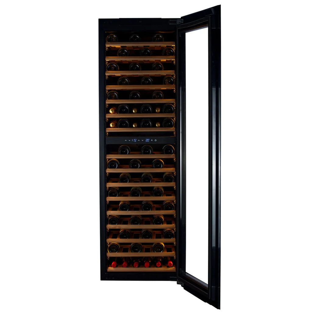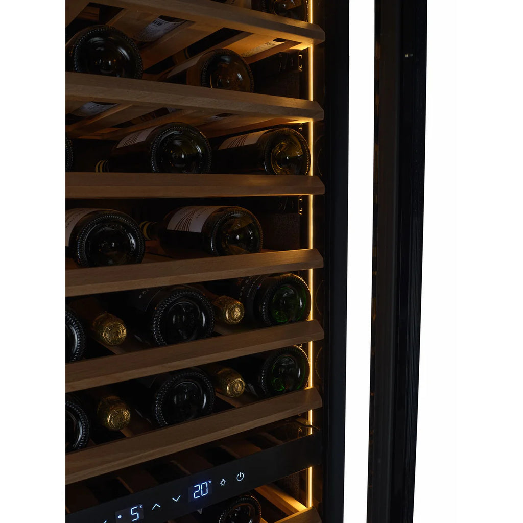 Similar to other manufacturers, the capacity is based on Bordeaux-style bottles but unlike others this fridge can store 96 Bordeaux or Burgundy shaped bottles. There are 15 beech wood sliding shelves included.