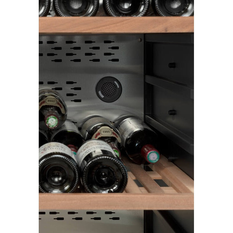Millésime wine cellars are equipped with LED side lighting on both sides, providing a modern and elegant way to showcase each bottle. This lighting enhances the visibility of your collection, allowing you to admire it fully. The cellars also feature sliding shelves made from rot-resistant solid sapele wood, designed to hold bottles either upside down or with the labels facing forward for easy viewing.