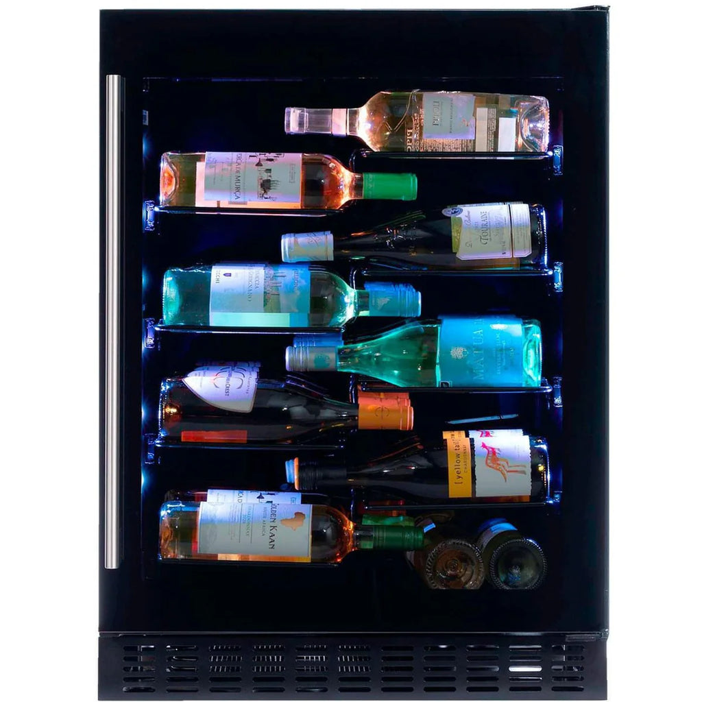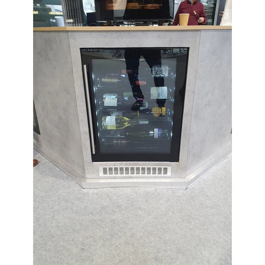 A premium, single zone, undercounter wine cooler that is both quiet and energy efficient. The attractive black design with stainless steel handle will look stylish in any home. The label facing, standout design and white LED lighting also give the cooler a premium feel. With versatility at the forefront, the wide hold shelving allows storage of all types of wine bottle shapes, from Champagne to Bordeaux, from Burgundy to Alsace.
