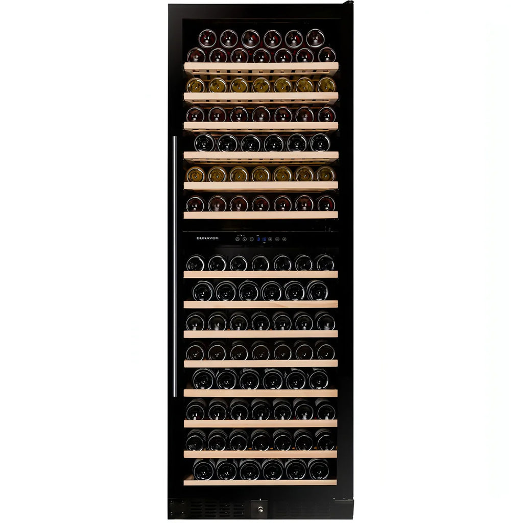 The Dunavox DX-181.490DBK is a dual-zone, full-height wine cabinet designed for freestanding or built-in installation, making it a stylish and practical addition to any kitchen, bar, or restaurant. With a capacity of 181 Bordeaux bottles (89 upper, 92 lower) and dual temperature zones (upper 5–12°C, lower 12–22°C), it allows long-term storage or optimal serving temperatures for red, white, or sparkling wines. The unit features a full tinted glass door with UV protection, blue LED lighting, and a digital temperature display, while 14 beech wood shelves on telescopic rails provide easy access and accommodate bottles up to standard Champagne size without damaging labels.