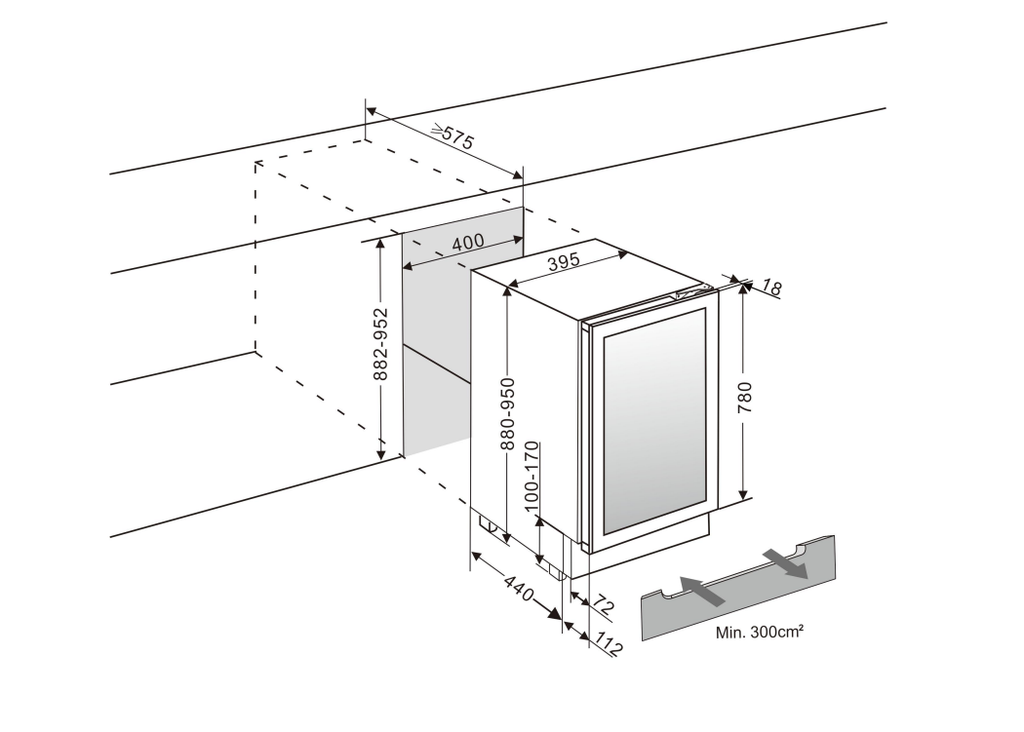 The WineCave 780 40D Panel Ready is a built in wine fridge and vents from a panel at the bottom, front of the wine fridge that must be kept free of obstruction.