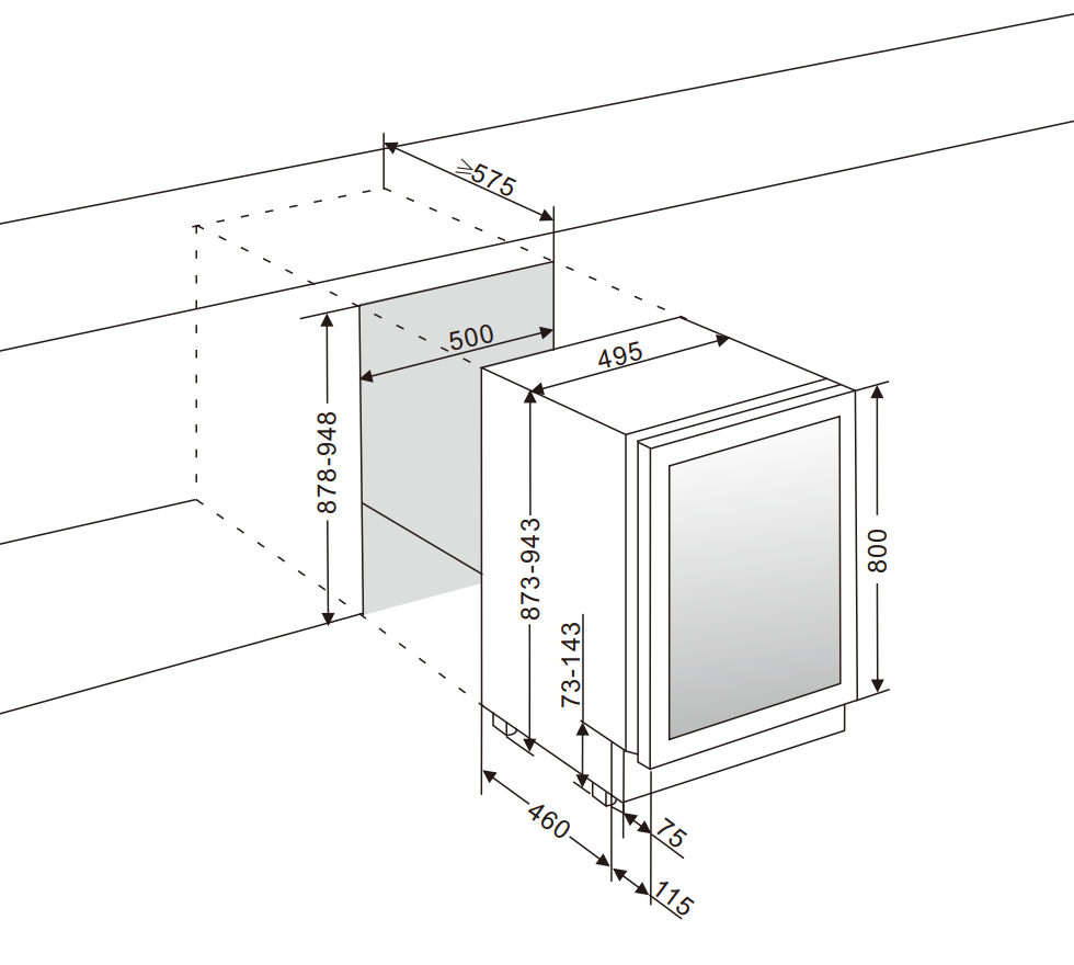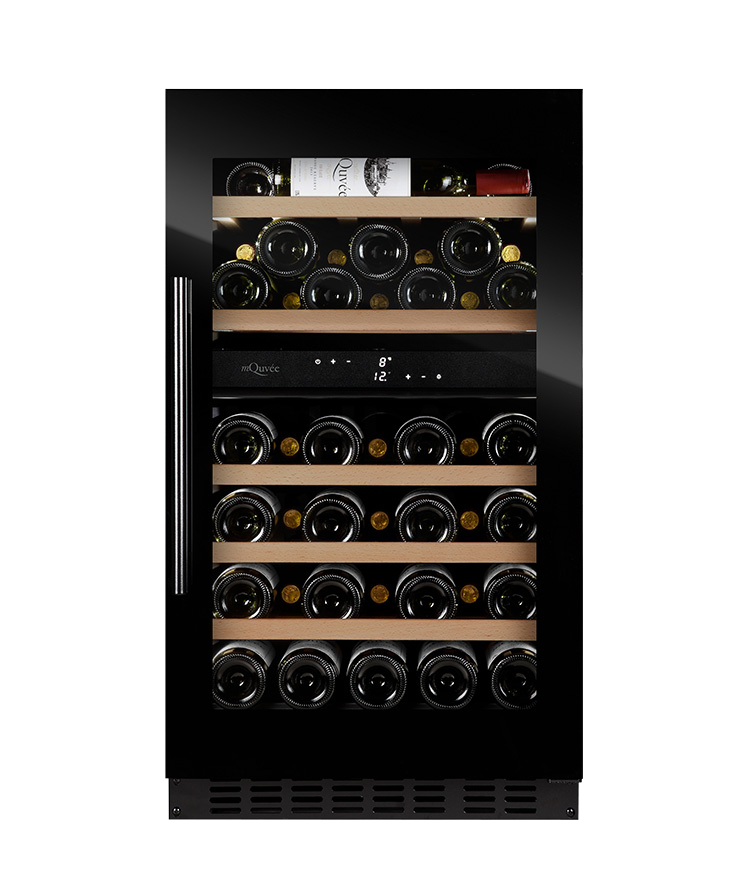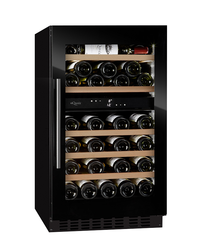 The mQuvée WineCave 800 50D Fullglass Black wine fridge is a superb value for money wine fridge at this price combining the reliability of the mQuvée brand with the adaptability of the unit with adjustable height between 87.5cm and 94.5cm to fit under taller kitchen countertops. The door height is 800mm.