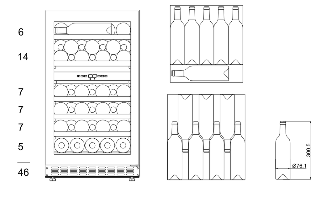 This wine fridge has the capacity, fully shelf mounted, to hold 46 Bordeaux style bottles. Larger format bottles, like Dom Perignon Champagne would require partial shelf removal whilst Burgundy and Alsatian bottles will fit upon the shelves.