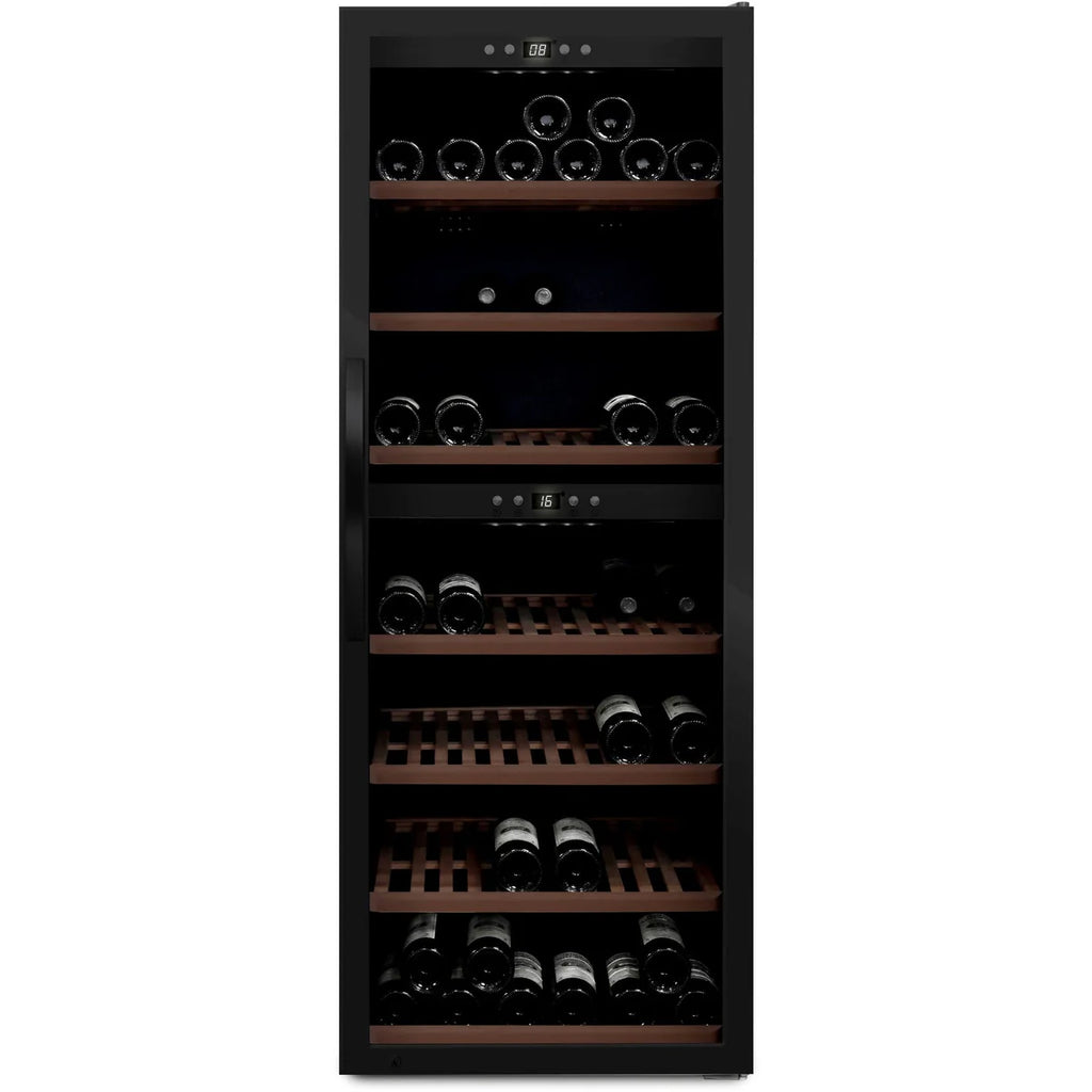 The mQuvée WineExpert 126 Fullglass Black is a free-standing wine fridge designed for serious wine enthusiasts, with a capacity of up to 126 bottles and dedicated space for all bottle types, including sparkling wines. Featuring two adjustable temperature zones, it allows optimal storage and serving of both reds and whites, with almost equal space for each. The UV-resistant full-glass door protects your collection from light damage, while the wooden shelves on smooth, stable runners allow easy access without disturbing bottles. A locking door and sleek, seamless design combine functionality with modern style.