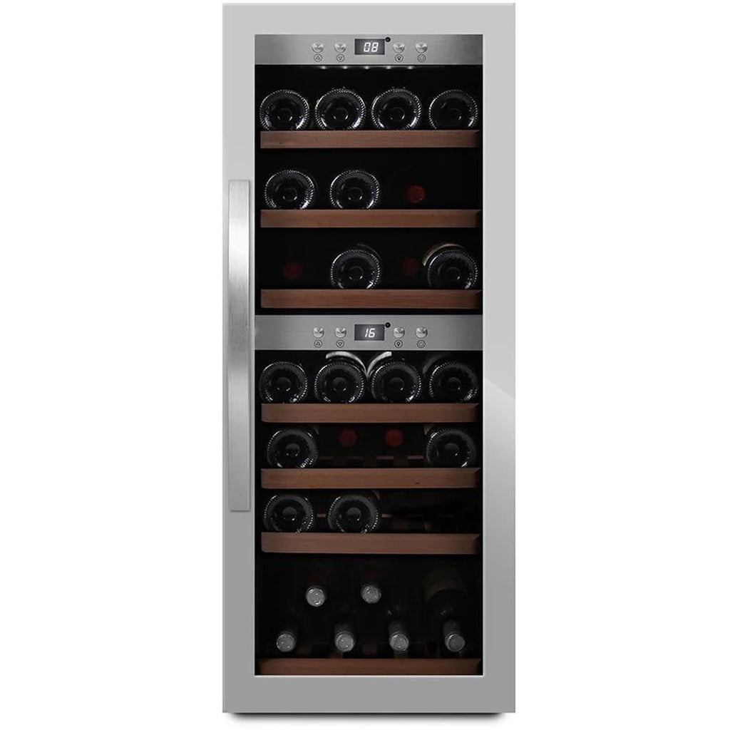 Crafted with smooth-gliding wooden shelves on stable runners, a UV-resistant glass door, and sturdy digital controls, this free-standing wine fridge exudes quality. The Smart Temperature Control System allows you to deactivate one zone when not in use, reducing energy consumption without affecting performance—perfect for smaller collections with room to expand.